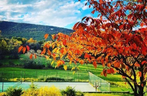 Nestled on private property of 175 acres facing the mountains, it boasts spectacular views confidently! There are 3.5 miles of hiking trails, a tennis court, and a peaceful pond for fishing. Catering options are available, featuring Japanese cuisine.