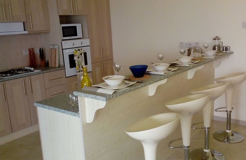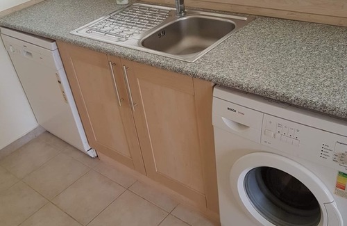 The fully fitted kitchen has four ring cooker, microwave, large fridge freezer, automatic washing machine, dishwasher, kettle, pots, pans, plates, and all the usual things you find in the kitchen.