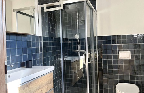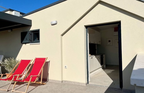 This beautiful apartment is located on the first floor of a family house and was completely renovated in 2022. It consists of a large terrace, living room with kitchen, two bedrooms and two bathrooms. Both bedrooms have king size beds and the living room has a flat screen TV. All rooms have air conditioning. Half of the terrace is covered with a canopy that opens and closes automatically depending on how much sun you want. Free parking for one car is provided in front of the house and inside our fence. There are many beaches and you can reach all of them on foot, and they are 100m or more away.