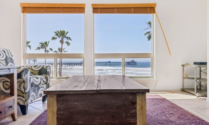 This Imperial Beach (IB) penthouse condo boasts a spectacular southwest view of the beach and famous IB pier. A full kitchen with all the necessities and seating for 6 at the dining table. There is a master bedroom with a queen bed and master bathroom with separate bathtub and shower. The 2nd bedroom includes 2 twin beds, and then there is 1 queen sofa bed in the living room. Guests can enjoy amenities like the heated pool, jacuzzi and a fitness room and BBQ. There is AC & heat and a wood burning fireplace. There is a washer / dryer machine in the condo for convenience. There is cable TV with DVD player and Wifi. The cool and soothing atmosphere of this condo will make your stay peaceful and relaxing. This penthouse condo is equipped for both long or short stays to make your holiday one to remember. There are two parking spaces which can accommodate SUV's available in the secure and gated garage with an elevator to the top floor.