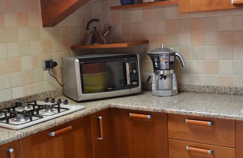 The kitchen, fully equipped has a fridge, microwave, 4-burner stove, new pots and pans, toaster, coffee maker. The apartment comes with linen and towels and everything needed for a comfortable stay.