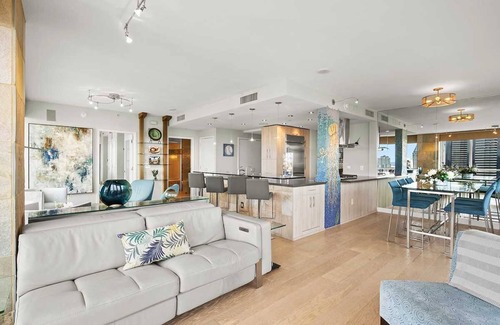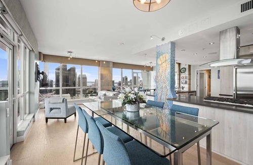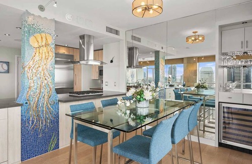 Picture-perfect panoramic views of San Diego Bay, Coronado, Point Loma, and the surrounding downtown cityscape elevate this gorgeously appointed two-bedroom, two-bathroom condo - just one of four penthouse-level units at The Legend. But the true crown jewel of the space is its one-of-a-kind bird's-eye view of Petco Park, which can be enjoyed from both the primary bedroom and living room. The unparalleled view leaves the viewer feeling as though they are in a private VIP suite, thoroughly immersed in America's favorite pastime. Abundant natural lighting illuminates a space rife with high-end finishes and unique designer touches, from the custom sea life mosaic gracing a kitchen pillar, to top-of-the-line stainless steel appliances and soft-close cabinetry. An ideal space to entertain, not just due to the in-house access to Padres games, concerts and events galore, this space boasts a dining table with seating for six next to a built-in dry bar with a sizable wine fridge. Additional seating at the kitchen island and two-separate conversation areas in the living room add to the entertainment appeal in a space bedecked in enchanting ocean shades. An inviting king-size bed is the focal point of the primary bedroom suite, that also boasts a double-door closet with built-in shelving, a sizeable Smart TV, a stunningly updated en-suite bathroom with a dual sink vanity, and an ultra-spacious walk-in shower. The guest bedroom offers a plush queen-size bed, a closet with built-in shelving, and more enchanting city and bay views.