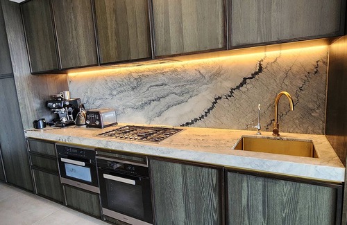 Sleek and well equipped kitchen with marbled kitchen island and benchtops, gas cooking, dishwasher, oven + microwave oven & barista style coffee machine