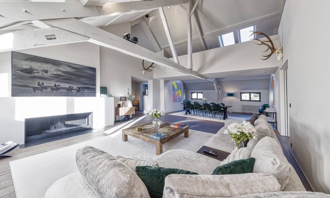 The living room has 3 large sofas, a comfortable chair, a work desk, a piano, a wood-burning fireplace, board games, multiple art books, an 85-inch TV, a SONOS sound system, and a mini bar.