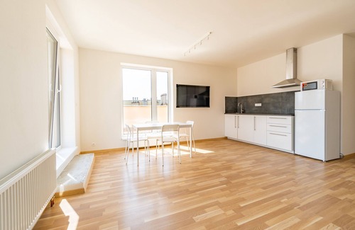 A brand new penthouse in the brand new building with a million dollar panoramic view of Prague, perfect for those Instagram Photos. Right on the tube ( 100 m from Palmovka station) and 7 minutes to the old city. Fully furnished with minimalistic Scandinavian furniture.