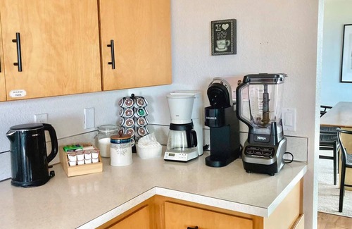• Kitchen is stocked with high-end kitchen appliances, cookware, silverware, servingware, basic condiments, keurig and grand coffee & tea