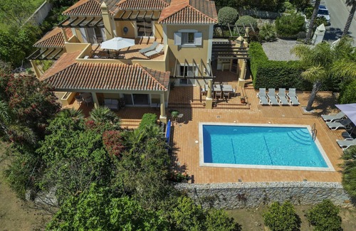 The villa has 4 large bedrooms and 4 bathrooms. The villa is set in a beautiful garden with private swimming pool and several terraces to relax and enjoy. At the terrace near the kitchen there's an outdoor cooking area with build-in BBQ. At the roof you'll find the rooftop terrace with stunning views over the golfcourses and all the way to the hills of Monchique.