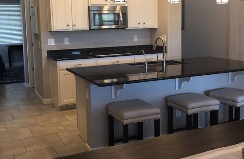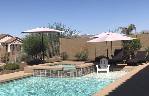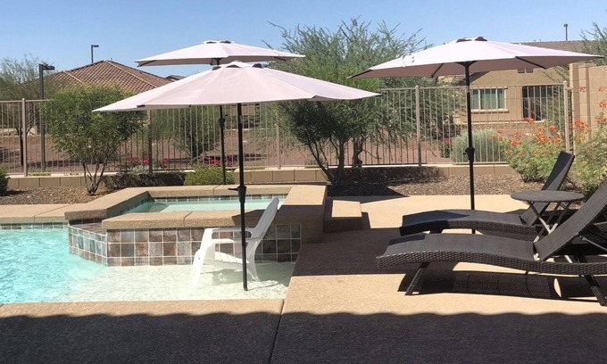 Wonderful vacation home for your Arizona Getaway, Sparkling pool and built in spa. Complete with built in umbrellas for shade, and relaxing in the pool or spa. Located with easy access to 1-10 and the 303 Loop. The backyard looks out on beautifully landscaped paseo. The backyard patio has a new grill and outdoor dining table. Close to shopping and dining, hiking, Phoenix Int Raceway, Spring Training Stadiums, State Farm Stadium, etc. The home is close to freeway exit, so you can get anywhere in Phoenix area.. The home has 4 bedroom. The master is huge with a luxurious master bath. Upstairs has a family room with a T.V. Two other bedrooms, one has a queen bed , the other has a full. Upstairs the bathroom is a full bathroom with a shower and tub combo and two sinks. Downstairs is another queen bed and full bath. The kitchen has new stainless steel appliances and granite countertops. A beautifully decorated family room and large 4K HD flat screen television. The home is ready for you, complete with beach towels, pool toys, we even have a portable crib. Our home is just over 3000 square feet, with plenty of room for your group to spread out.