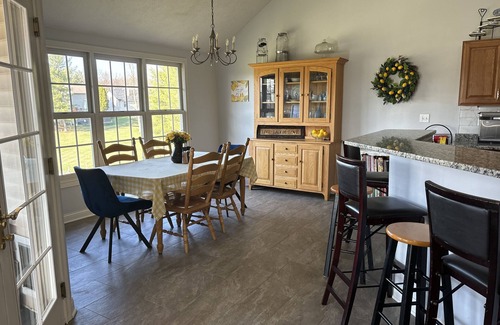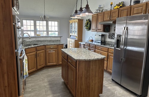 Come use our home for an amazing vacation! If you are coming for the eclipse, we have a large grassy area with no obstructions in the backyard, or stay on the back deck for a view of the sky and access to the main floor of the house. During your downtime, enjoy playing in the walkout basement which features a theater room, game room with ping pong, video games and pop-a-shot, and its own snack bar with popcorn maker, hotdog roller, and vending machine. We are 20 minutes from the art colony of Nashville, IN where you can spend time wandering the cute shops on Main Street eating freshly churned ice cream or watch fudge being made in the different candy shops. Downtown Columbus is 10 minutes away with it renowned architectural buildings. Walking trails are easily accessed from the house and will take you through neighborhoods and parks with views of different lakes and ponds. With beds for 6 and a pullout couch for two more, there is room for the entire family. We also have air mattresses if needed.