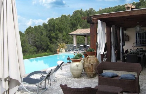 Arriving through the gate live your car in the driveway there is room to park 2 or 3 car. Take the stairs and arrive into a spacious out door lounge dining with views of spectacular countryside and swimming pool with another dining room closed by glass doors opening onto another patio with stairs leading to the sun deck with amazing views of the surrounding countryside. Pool level an elegant and formal living room, a family room, several televisions through out the house. A large fully equipped country style kitchen with a breakfast table, a dining room plus a family room. A door into the master bedroom with views to the patio, a master bathroom with en-suite bathroom with bathtub. The user level can be reach either by the formal living room or by the master bedroom both have a stairway leading to the 3 bedrooms, 2 with a double beds, 1 bed room with 3 beds ideal for youngsters with 2 bathrooms with showers, all bedrooms have a patio view. Lower level a spacious study with a double bed with en-suite bathroom with shower.
