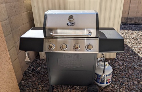 The backyard boasts a nice in-ground, swimming pool, new gas grill (propane is provided), and patio furniture.