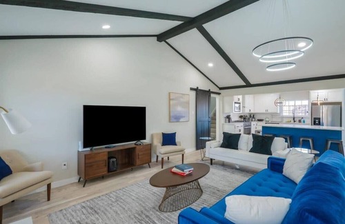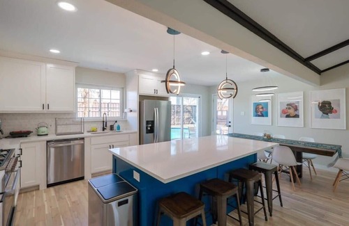 You’ll enter into a bright, spacious, open concept living area and immediately be able to see straight across the home at the pool shimmering in the backyard. You’ll notice the home is completely remodeled with numerous modern updates all throughout. The living room features high vaulted ceilings with exposed beams, beautiful light flooring, and a lovely fireplace. With lots of natural light flooding in, the space seems even bigger! You’ll love hanging out in this area as a group as you enjoy the cozy couches, watch some TV or movies/games in your own private cinema room, play games, reminisce about the day, and make plans for the next one.