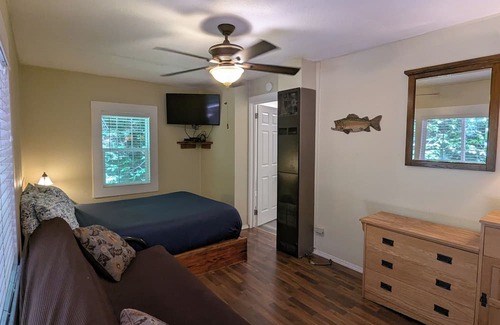 There is a beautiful deck that wraps around 2 sides of the Cabin for your outdoor pleasure. Down the stairs you have your own private front yard with a fire pit (you can also grill on this), outdoor chairs and a picnic table with benches. Also plenty of room for boat parking.