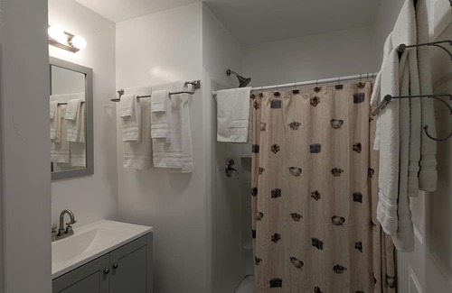 Cabin 19, "The Salmon Slammer", is located at Woodland Villa Cabins, Restaurant and Market in Klamath CA. Where "the Klamath River Meets the Pacific Ocean in the Heart of the Redwood Forest." The cabin boasts a full kitchen, private bedroom with a queen size memory foam bed, bathroom and living area. The bathroom also has an entrance from the bedroom and an entrance from the living area. The living area also has a queen memory foam bed and two futon sofas with inner spring mattresses the pull out to full beds.