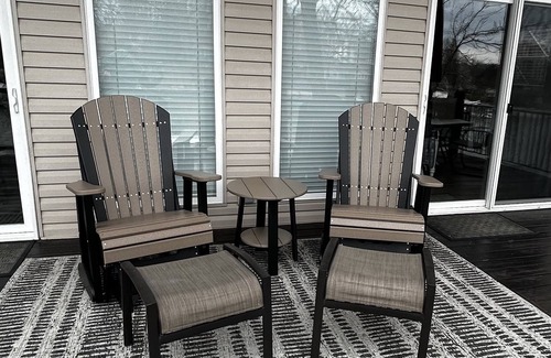 LARGE PRIVATE DOCK – Stairs leading down from deck to the large private dock. Where you have access to Dock TV, Alexa, TV for watching games or late night movies. Polywood Dining Table, and Outdoor seating with Gas Firepit sitting area.