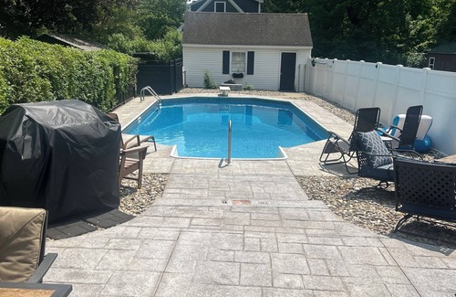 4 Bedrooms, 2 full bathrooms, brand new eat-in kitchen, min splits, window air conditioners, living room, dining room, updated living room with a view of the amazing back yard. In-ground, heated swimming pool with stamped concrete patio, perfect for entertaining. Grill and pool house. Wifi, Spectrum cable that includes TVG.