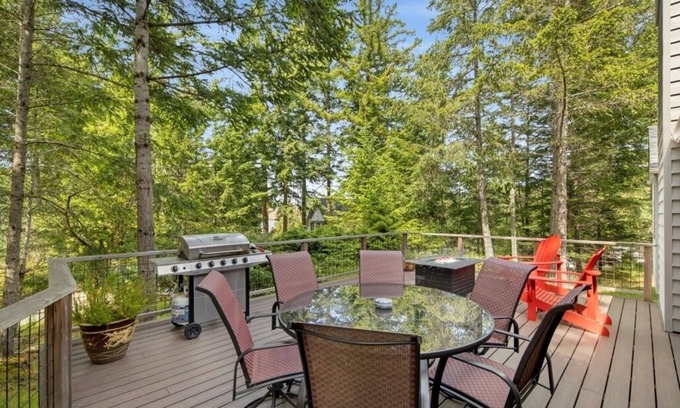 The expansive deck with a peekaboo view of the ocean across to Speiden Island offers a dining table with seating for 6, propane firepit table and propane barbeque grill (1 filled propane bottle for each provided) and is a great place to relax and unwind from a day's adventure, or to enjoy the serenity of the surroundings which include beautiful madrona, fir, and evergreens and abundant wildlife such as deer, eagles, native birds and fox.
