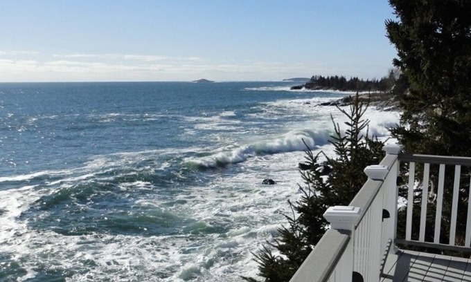 We are located directly on the coast.. versus on the "bay" or "harbor", and the views from this custom designed cottage are some of the nicest you will find. We are situated just high enough to provide protection from the ocean, but close enough to hear the waves and surf at all times of the day. Being so close to the water, the feeling in the cottage is a lot like being on a large boat. THERE IS NO ROAD and NO POWER LINES between OUR COTTAGE AND THE OPEN OCEAN. You have an unrestricted and very private view of the open Atlantic and surrounding islands and harbors from our deck. This is hard to find, even in Maine. Nobody walking or driving on a road between you and the sea? Priceless! We also allow most breeds of dogs for a modest fee, but PLEASE CONFIRM BEFORE BOOKING that your dogs age and breed are allowed. That the minimum age of any child is 10. Maximum guest size is 4 (four). The cottage features two queen sized beds, one on each floor, with access to a bathroom on each floor as well. Boothbay Harbor, with all it's charm, galleries, shopping and restuarants, is less than 10 minutes away. Our cottage is situated on a little known oceanfront drive. our quiet road is one of the best kept secrets around and offers views and ocean walks as nice as you will find, but with far fewer people than some areas. Imagine yourself on our deck with a sliver of moonlight coming across the Atlantic and right to you!