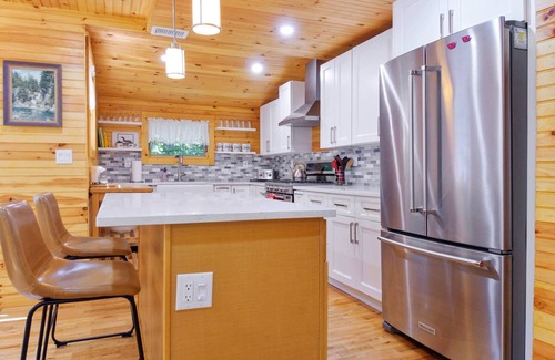 Inside, bask in the warm ambiance of sun-kissed spaces, thanks to the kitchen, dining, and living areas adorned with large windows that filter gentle rays of sunlight. The living room boasts high ceilings that lend a sense of openness, inviting relaxation and tranquility. Equipped with state-of-the-art appliances, central air conditioning, heating, and a nostalgic pot belly stove, the cabin embraces a seamless fusion of past and present. With three bedrooms and two full baths, including a master suite featuring a king-size bed and an en-suite bathroom with a claw foot tub, your comfort is assured.