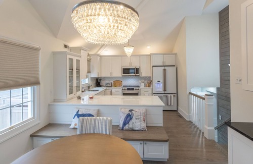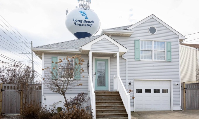 Let the vacation begin as you walk through the door to a beautifully remodeled open concept home with luxury amenities perfect for the whole crew! Enter into a spacious living room with cathedral ceilings, wide windows and modern shiplap accent wall, equipped with a 65" smart TV and an electric fireplace. Relax on the oversized sofa after a long day at the beach (Queen bed pullout) or make yourself comfortable at the family style dining room table, with a gorgeous built-in bench for extra seating. Adjacent to this, is the built in bar...need we say more. The coastal vibe continues into the incredible kitchen with tastefully appointed white appliances and gorgeous white marble countertops. Here you will find an echo dot for some tunes, Nespresso machine, Keurig, toaster oven, pots and pans, baking ware, bowls, dishes, serving platters and utensils galore. Upstairs you will find yourself at a princess balcony overlooking the first floor, 2 guest bedrooms, 1 full bathroom with double sinks, washer/dryer, and a gorgeous Master bedroom with a beautiful modern ensuite. Each bedroom has ample space to make yourself at home during your stay with huge closets and 9-foot ceilings. We have spared no expense for your comfort, which includes ceiling fans, recessed lighting, blinds, brand new CLOUD mattresses in every bedroom (paired with CLOUD pillows), and the coziest beach inspired bedding. As if your coastal oasis couldn't get any better, walk a few steps down off the kitchen into a fabulous guest area where you will be pleasantly surprised by its ambiance and charm. An area where the options are endless. The kids can play or take a midday snoozes (enough space for a pack and play), take out your yoga mat and enjoy the calming atmosphere, or turn on the tv and fireplace, pop some beers in the mini fridge and sit back and chill in the two-person sofa. (Which also pulls out into a bed). A sliding door off this room, will bring you to a spacious outdoor retreat where you can play yard games, barbeque, and relax around a fire pit, gazing up at the stars. Don't forget to take advantage of the large outdoor shower, a great way to start or end your day in paradise! When you are not enjoying the beauty and comfort of this home, take a short walk to the end of the street (bayside) and sit on a cozy bench to take in a breathtaking sunrise and sunset. And just a block over, is the sprawling, white sanded beach of LBI (6 beach badges will be included in your stay along with 6 Beach Chairs). The home is super convenient as it is in close proximity to Acme, Skipper Dipper, Blue Water Café, Jersey Girl Bagels and so much more.