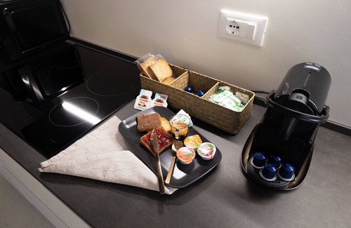 ✔ Coffee machine, sugar, Nutella, tea