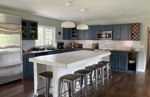 We renovated this home for our large family of six to be able to spend time together, away from the routine. We have loved spending time in Southwest Michigan and are excited to share our home with others. The house has an open concept kitchen, living and dining space. The dining space opens to the screened in porch overlooking the deck space and heated pool. The kitchen is fully equipped with all you need for cooking and baking. Kitchen also has a coffee pot with option for single -serve pods or a whole pot. Kitchen island seats 6 comfortably.