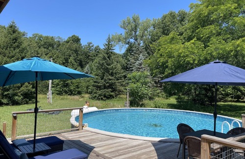 Lovely farmhouse in thriving Three Oaks, Michigan. Three bedrooms, two with queen beds and the third is a great kids room with four twin beds. Open floor plan eat in kitchen, large island and screened in porch off the dining space. Large multi-level deck connects to the 30' heated pool. Six acres of space for the kids and adults to run and roam (or use the golf cart if you prefer). Plenty of space in the barn to store bicycles and other items. Pool is heated and open Memorial Day thru late September.