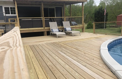 Two bedrooms feature queen beds, one with an additional toddler bed. Bunk room has twin bunk beds, twin bed and a twin trundle. Sliding doors open to the screened in porch and multi-level deck which surrounds the pool. The home has a mudroom off the deck with a full-size bath and washer and dryer for quick run-ins from the pool/outdoor space. The firepit and the front deck are the best spots for meteor and star gazing at night.