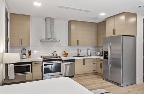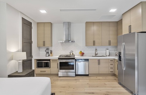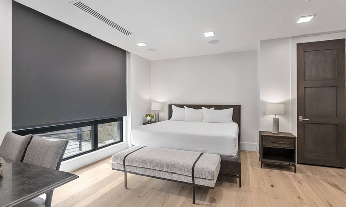 This cozy studio residence features a king bed, a closet, in-unit washer and