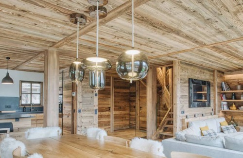 Designed with a mix of modern and traditional Alpine décor, the interiors of this beautiful chalet feel spacious and bright, thanks to the large windows that allow guests to enjoy the view of the surrounding mountains. The ground floor offers a fully fitted open plan kitchen with a dining room and a living room with fireplace to enjoy cozy evenings inside.
