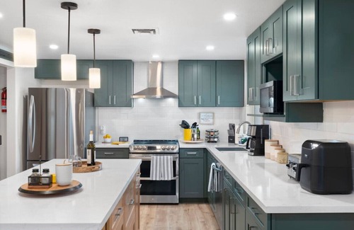 Kitchen Fully Stocked with all you need to prepare meals for your family. Brand NEW stainless refrigerator & newer oven/ stove. Quartz countertop, drip coffee maker and space to sit at the kitchen island with seating for 4.