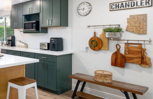 In the heart of the Southeast Valley, a cultural mecca and foodie paradise, this lovely 3 bedroom 2 bath home has been lovingly remodeled with your comfort in mind. Both the indoor and outdoor spaces delight the senses with subtle luxuries and practicality: quartz countertops, dedicated workspace and of course, backyard outfitted with many different seating areas. We have outdoor umbrellas that also offer shade, a corn hole game, a comfortable outdoor living area, a dining table.