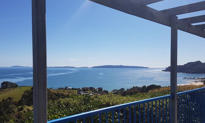 Nestled on the hill above Kuaotunu Beach with its commanding sea, bush and rural views. This cosy two bedroom cottage is the perfect place to relax, unwind, enjoy the natural beauty that surrounds you. Abundant bird life and friendly farm animals add to this peaceful setting far removed from city life. The cottage is bright, sunny, comfortable and private. The double room has a Queen size bed with cotton bedding, it's own bathroom with a bath & shower and a glorious view out to sea. The dining room has basic cooking facilities as well as a fridge, coffee machine, variety of teas, coffee & milk. The second bedroom has two single beds, with it's own bathroom. There is a TV/DVD in both rooms. A selection of DVD's are available for those wet days to chill out. The whole building is 70 square meters with a terrace along the front with outdoor seating and a Barbecue.