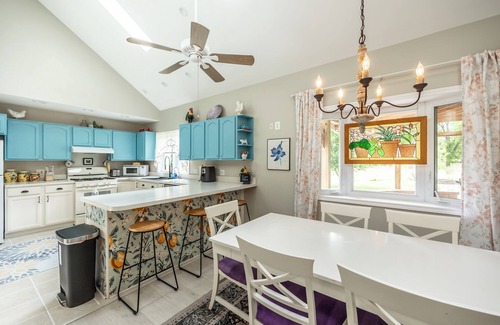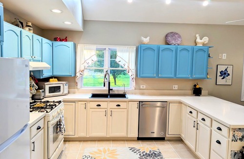 Inside, there’s a roomy upstairs living area, perfect for relaxing together. The kitchen is fully stocked with everything you’ll need to cook meals, and there’s a coffee bar for your morning cup. Bedrooms are spacious, and we also have a laundry room to make longer stays easy. Families will find everything they need here—crib, pack-n-play, high chair, toys, books, and puzzles for kids of all ages.