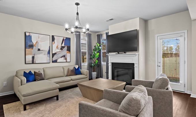 Nestled in the heart of Marietta, this exquisitely remodeled guesthouse offers a blend of modern comfort and timeless charm. Perfectly positioned near Atlanta's top attractions, it serves as an ideal sanctuary for family vacations, business trips, long-term travelers or those seeking a serene getaway. The open floor plan creates a welcoming ambiance, featuring a cozy living room with a 4K Samsung TV, electric fireplace, and ample seating for gatherings or quiet evenings.