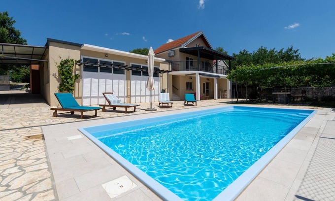 This vacation home is located in the village of Zaton Obrovacki, in a rural environment, not far from the river Zrmanje. Experience a different vacation and escape from the city bustle. You can do your shopping in the nearest village Obrovac, through which flows the river Zrmanja. The accommodation has three bedrooms, two bathrooms, kitchen and living room. Refresh yourself in the pool. On the upper floor you have a beautiful view of the countryside.