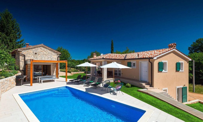 The beautiful Villa Mathilda is located near Zminj. Surrounded by forests, olive groves and unspoiled nature, this villa is ideal for 6 adults and 2 children. In the well-tended garden, the pool invites you to refresh yourself on hot summer days. There are sun loungers and a parasol around the pool. A dining area with barbecue is available on the covered terrace - perfect for a lovely barbecue evening with your loved ones! You can relax in the jacuzzi and sauna. Fitness equipment, table soccer and darts are also available. Children can look forward to a playground in the garden. On the ground floor you will find the spacious and elegant living room, the fully equipped kitchen with dining area and one of the bathrooms. On the lower floor there are 3 air-conditioned bedrooms, each with its own TV and en-suite bathroom. If you want to spend a relaxing vacation, then Villa Mathilda is the ideal place to do it.If all roads in Europe lead to Rome, all roads in Istria lead to Zminj, the center of Istria and the old interface. The vacation home is located just outside Zminj in an ideal location for exploring the region. In the village you will find all amenities, stores, restaurants etc. The picturesque medieval hilltop towns, traditional villages where time has stood still and landscapes of unique beauty are ideal for scenic drives, cycling and hiking. Excellent traditional cuisine and first-class wines, for which this region is world-famous, add the final ingredients to an unforgettable vacation. Wherever you arrive, the locals will offer you a wonderful, warm welcome to this fascinating region. The coast with its major tourist centers is only a short drive away, as is Pula airport. Istria is well connected and has an excellent, uncrowded road system.