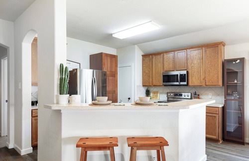 Your Roanoke adventure begins at this 3-bedroom house. With 2 king beds, a triple bunk room featuring a queen/twinXL/fullXL bed, this property offers a variety of sleeping arrangements for guests. The house features 2 bathrooms with a bathtub and shower, ensuring a comfortable stay. Additionally, guests can enjoy the large living room and private office, both equipped with sofa beds. All home entrances are wheelchair accessible and the master bed/bath offers double-door entry, shower and toilet grab bars. Enjoy the fenced backyard with lounging under the pergola. The home is pet friendly! Two wonderful neighborhood parks and splash pad for the littles within walking distance. The sidewalks throughout the entire neighborhood is great for jogging, strollers, bikes and dog-walking. Experience a soothing and enjoyable stay at this fantastic property. Feel free to reach out to us during your stay - we're happy to suggest local spots to check out.