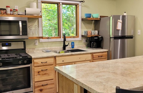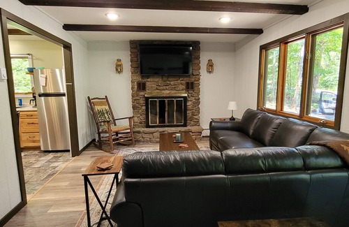 Relax with the whole family at this lovely newly renovated 2 bedroom cabin, one bathroom, full kitchen, spacious living room with leather furniture. Bedroom 1 has a king bed and TV. Bedroom 2 has a queen bed and a TV. Enjoy the fireplace AND BBQ outside along with the screened gazebo. There is a screened in back porch off the kitchen for enjoying food or drinks, facing the woods. Feel free to message questions. We do collect a $75.00 dog fee cash or check. We also offer Pontoon, Kayak, and e-bike rentals. The rail trail is just 1/8 of a mile down the road, with access for biking, skiing or snowmobiling. Plenty of room to park your snowmobiles on the property and have access to miles of groomed trails.