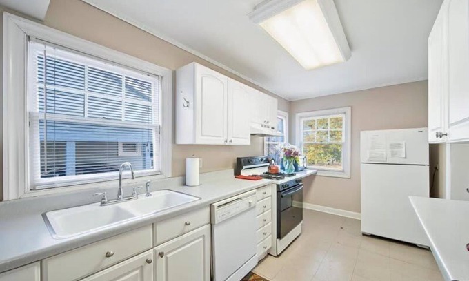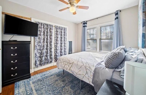 Our home features a spacious living area with hardwood floors and comfortable seating, perfect for relaxing after a day of exploring the city. The fully stocked kitchen features all the appliances and cookware you need to prepare delicious meals, including a gas range, refrigerator, microwave, and dishwasher.