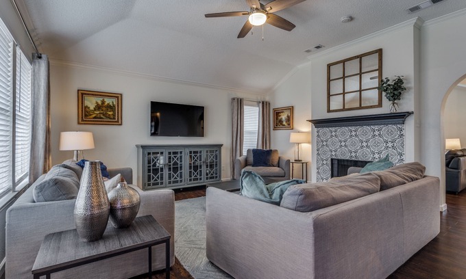This Allen, Tx home is perfect for you, your family, and pets! It's located in a great neighborhood that is just down the street from Celebration Park and nearby to grocery stores, restaurants, shopping and anything else you may need. During your stay there is plenty of room for everyone to relax, unwind and spread out. This home has two separate living areas, a home office with two workspaces, a stocked kitchen, eat in breakfast table, front and back patios, and a fenced backyard to let the dogs run in. Laundry and garage parking are both available, too. Keep connected while you're here with our Google mesh wifi and stream all your favorite shows on our smart TVs. When it's time to go out, you'll be just down Main St. from Central Expressway (75) giving you quick access to Plano, McKinney, Richardson, Dallas and many other great North Texas cities.