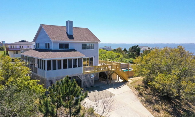 Jessica's Dune, an oceanside home in Duck, is the perfect location for your Outer Banks beach vacation. Everyone in the family will love vacationing in Jessica’s Dune, even your four-legged member! This pet-friendly home boasts breathtaking panoramic views of the Currituck Sound and is only 475 yards to the beach! After a long day at the beach, enjoy the gorgeous sunsets from the private hot tub, deck or pool. Feel the warm, summer breeze from the screened-in porch and soak up your next vacation at Jessica's Dune. The home provides a private saltwater pool with sound views!