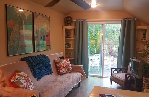 Serene and private setting where your fur babies can frolic while you sit by the fish pond and sip margheritas. Charming one BR, 1 BA cottage with every amenity you could need just 1.5 miles from Grey's Beach. Kitchenette includes microwave, toaster oven, two plug in cook top units, coffee maker, full cookware set and dining set. There is also a newer gas grill on the patio. We are former Airbnb hosts; this is our 1st time on VRBO so please see pictures of notes left by happy vacationers in past years.