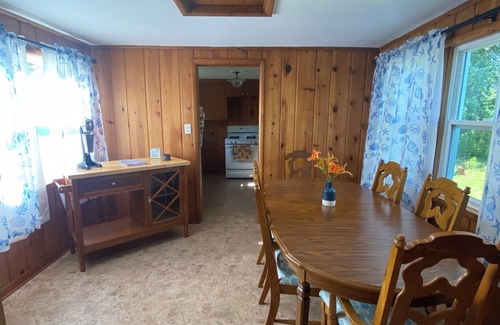 Relax with the whole family at this peaceful cabin with a beautiful view. Sleeps 8 comfortably. Sandy shores just steps away with breath taking clear water. Not located directly on the water, but across a quiet drive. Beautiful view of the water to Watch the sunrise and set from the living room. Enjoy a bonfire with your family in the quiet back yard while stargazing. Large living room for family to gather. Spacious bedroom with king bed and luxurious Tempur-pedic pillows. Second Bedroom with two twin beds. A queen size pull out sofa bed in the living room, as well as 2 queen size air mattresses . Indoor woodstove for those chilly nights. Bring your furry friends with to play in the sand. Bring your bikes and bike in a quiet area off of the busy main road. Large kitchen table to seat 6 people for a home cooked meal or try out one of the local restaurants. Linen provided for all beds and extra pillows. Board games, cards, and various books provided.