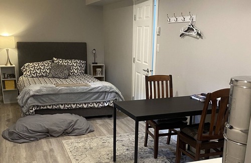 The Dog's Den is a newly renovated basement suite. Featuring a queen size bed, private bathroom with shower, 55 inch TV with smart capabilities and free wifi. This is a pet friendly suite with anti-bacterial flooring , water proof doggy blankets and a cozy dog bed. We are located one block from downtown and 3.5 blocks to the dog park. Free Parking located in the back.