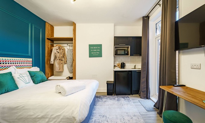 This studio is located on the ground floor of our self check in property and boasts: Double bed smart TV, kitchenette with kettle, sink, fridge, microwave and welcome refreshments plus an ensuite shower room. This studio has the added benefit of a private patio and is pet friendly, allowing one dog for an extra cleaning charge, if the £30 charge isn't applied during your booking we will contact you with a payment link before your check in.
