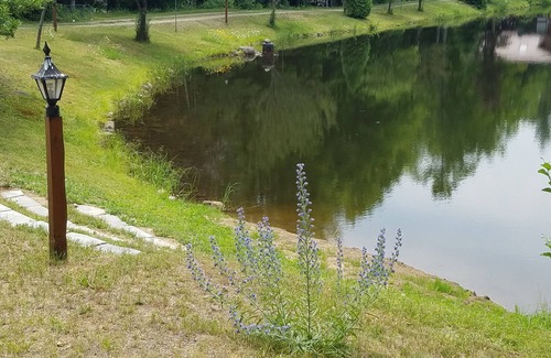 There is a 4 bedroom Log House across from the pond which can sleep 10 people along with a 2 bedroom guest house that can sleep another 8 people.