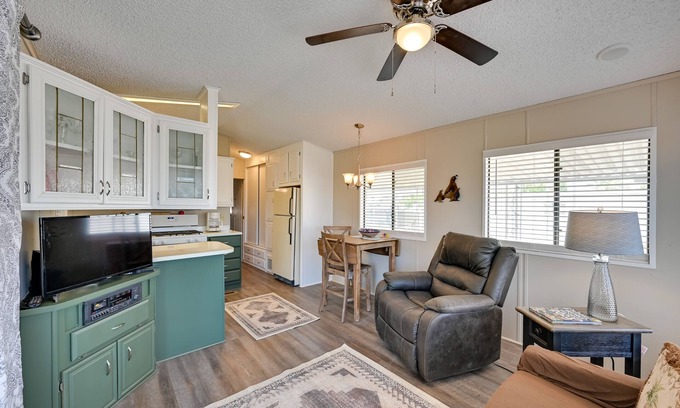 Fill your days with sunshine on the partially screened deck of this 1-bedroom, 1-bathroom home, inside by the Smart TVs, or nearby at Arizona Market Place where vendors and live music can be found, depending on the season. Whether you want to go fishing at Fortuna Lake or golfing at Mesa Del Sol Golf Club, this guest-ready getaway with a well-equipped kitchen and laundry shed will help you and a romantic partner or best friend rejuvenate with ease!