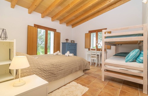 The two-storey house, recently renovated and decorated in the most typical Mallorcan style, has spacious rooms. On the ground floor you will find a cosy living room with fireplace and TV-sat, perfect to liven up your evenings. The separate kitchen with a glass-ceramic stove, is fully equipped and also has a dining area. The house also has a washing machine, an iron and an ironing board. On the same floor there is also a bedroom and a bathroom with a shower. The bedroom, which opens onto the terrace, has a double bed and a bunk bed. On the first floor, which is accessed by a staircase, there is a bedroom with a double bed and AC and a bathroom with a shower.