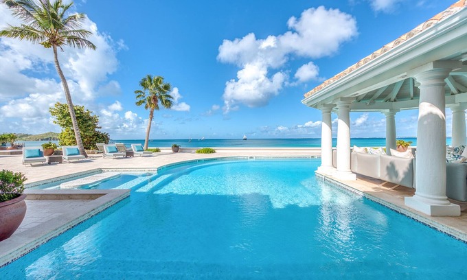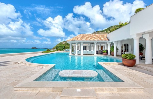Covered and open terraces span the length of this estate villa. The large horseshoe-shaped heated pool sits at the sea's edge. In the center of the horseshoe is a covered loggia for relaxing by the pool. A hot tub sits near sits nearby for ultimate relaxation. Additionally, the villa also has an onsite manager skilled in taking care of your needs and easy access down the beach to Grand Case Beach Club restaurant and bar.